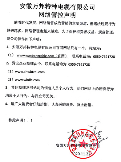 鄭重聲明:安徽萬邦特種電纜有限公司官方網站為:www_wanbangcable_com.js00.cn,除此之外無任何子網站或合作網站,其余均為假冒偽劣。電話:0550-7621728 13485756353 地 址:安徽省天長市滁州高新技術產業開發區經四路29號
